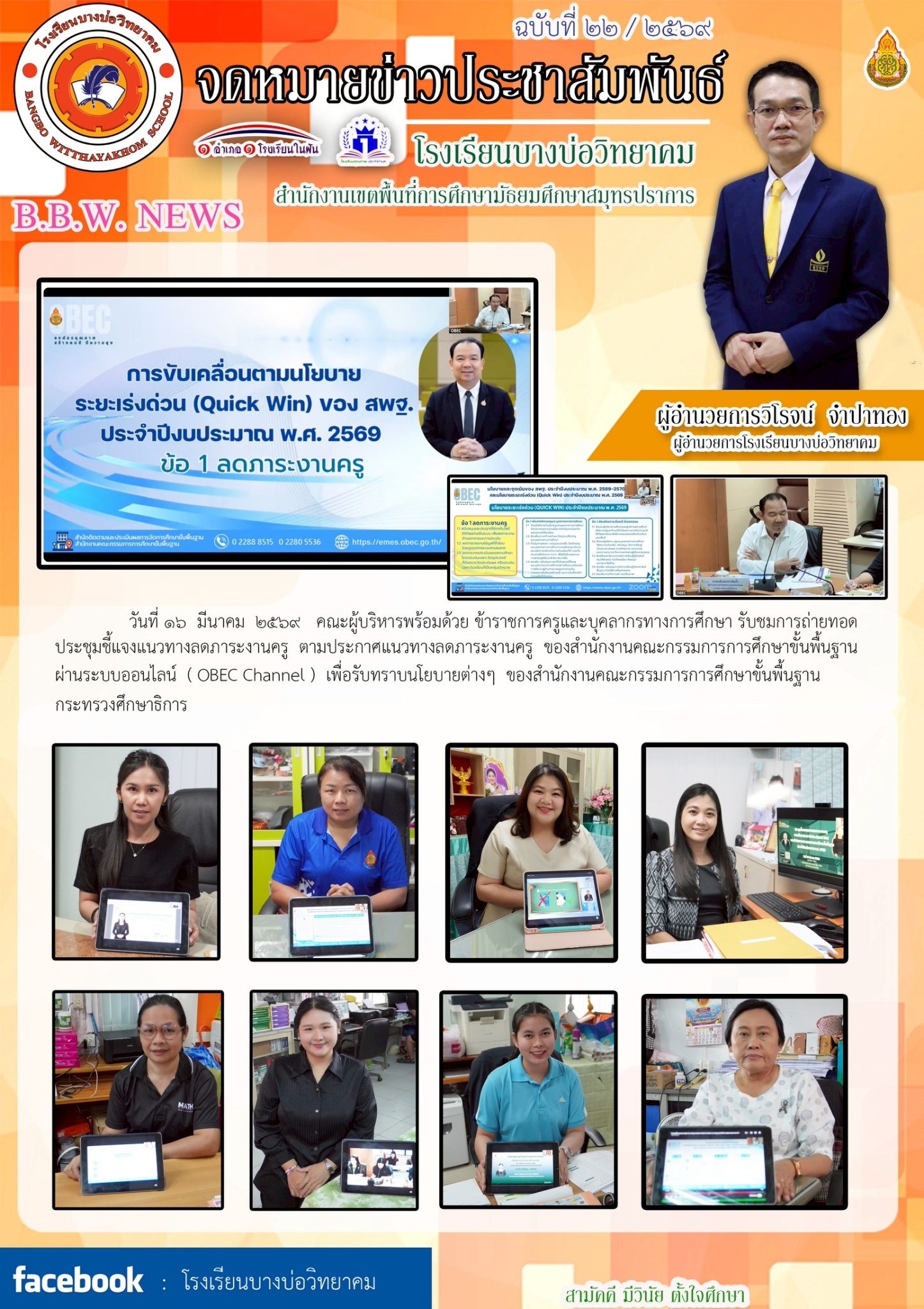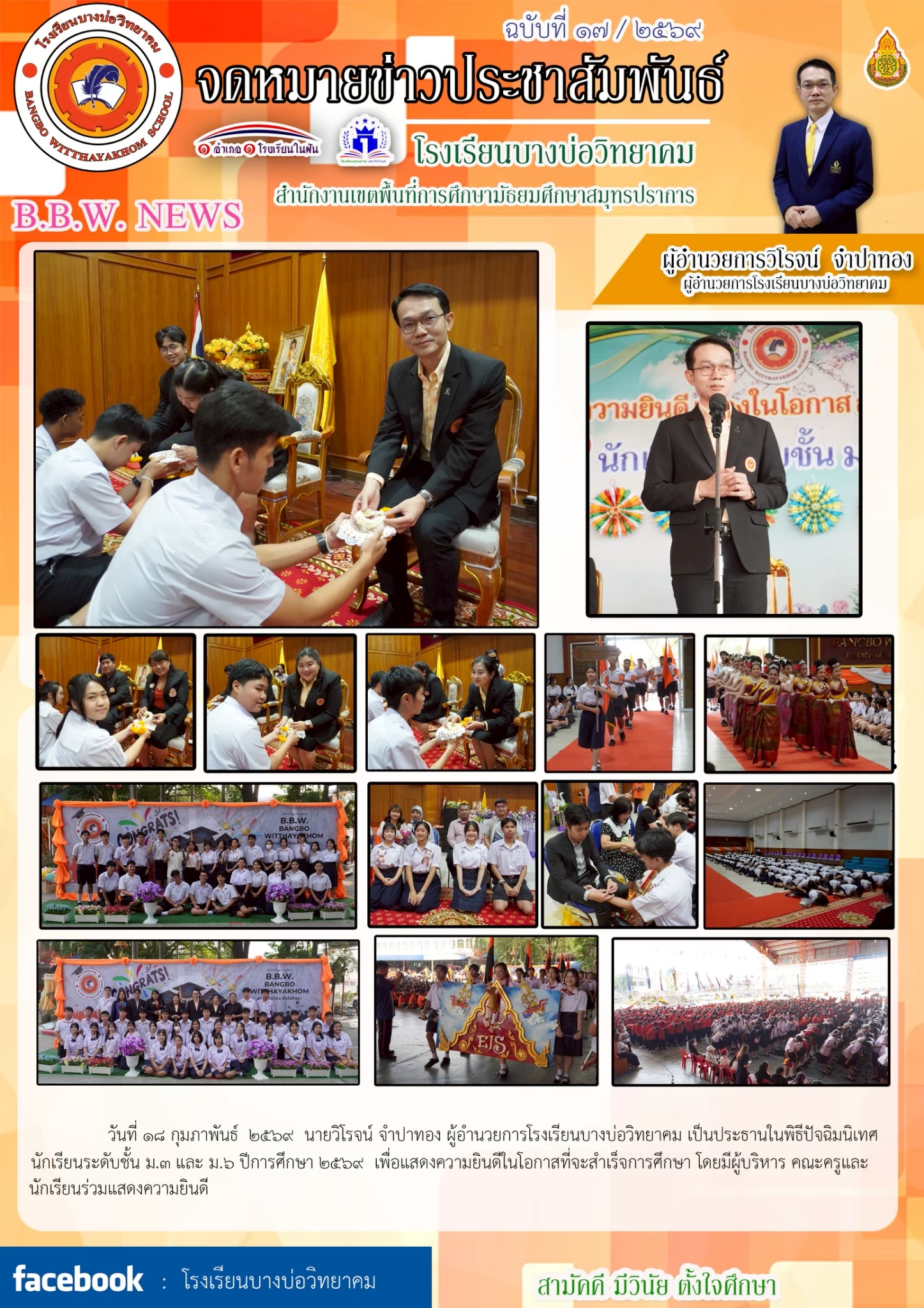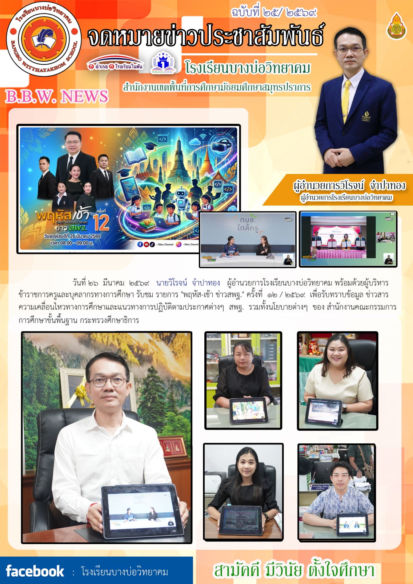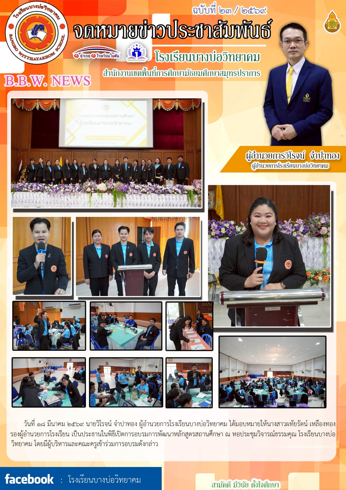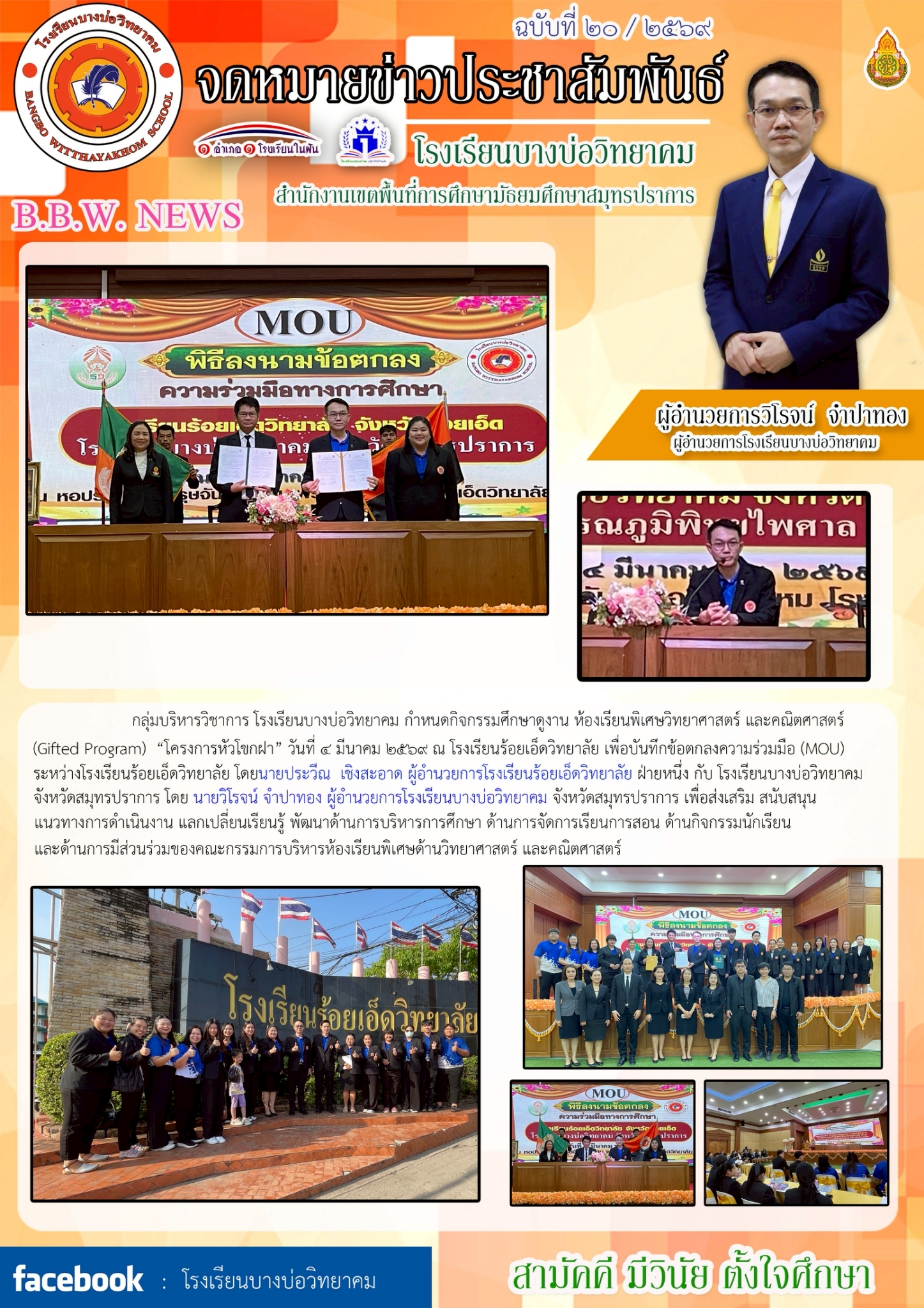 🗞 ข่าวประชาสัมพันธ์ ประกาศรายชื่อนักเรียนลำดับสำรองในการสอบคัดเลือก นักเรียนระดับชั้นมัธยมศึกษาปีที่ 4 ประเภทห้องเรียนปก…ประกาศ เปิดรับสมัครผู้ประกอบการร้านค้าประกาศรายชื่อนักเรียนที่ผ่านการสอบคัดเลือกเข้าศึกษาต่อระดับชั้นมัธยมศึกษาปีที่ 1 ประเภทห้องเรียนปกติ…ประกาศรายชื่อนักเรียนลำดับสำรองในการสอบคัดเลือก นักเรียนระดับชั้นมัธยมศึกษาปีที่ 1 ประเภทห้องเรียนพิ…ประกาศ รายชื่อผู้มีสิทธิ์สอบคัดเลือกเข้าศึกษาต่อระดับชั้นมัธยมศึกษาปีที่ 1 ประเภทห้องเรียนปกติ ประจำ…ประกาศรายชื่อนักเรียนที่ผ่านการสอบคัดเลือกเข้าศึกษาต่อระดับชั้นมัธยมศึกษาปีที่ 4 ประเภทความสามารถพิเ… 1…123…16 📜 จดหมายข่าว จดหมายข่าวทั้งหมด 🏆 รอบรั้ว บบว. 📢 ข่าวประกาศ ประกาศจัดซื้อจัดจ้างประกาศรับสมัครงาน ประกาศ เปิดรับสมัครผู้ประกอบการร้านค้าประกาศ เรื่อง การจัดจ้างทำประกันอุบัติเหตุสำหรับนักเรียน ประจำปีการศึกษา 2569 โดยวิธีคัดเลือกประกาศ การจัดซื้อหนังสือ ประจำปีการศึกษา 2568ประกาศ เรื่อง การจัดจ้างทำประกันอุบัติเหตุสำหรับนักเรียน ประจำปีการศึกษา 2568 โดยวิธีคัดเลือกประกาศ รายชื่อผู้ประกอบการร้านค้าจําหน่ายอาหารในสถานศึกษาปีการศึกษา 2567ประกาศ รับสมัครผู้ประกอบการร้านค้าจำหน่ายอาหารภายในสถานศึกษา ปีการศึกษา 2567ประกาศ รายชื่อผู้ได้รับคัดเลือกผู้ประกอบการร้านค้าจำหน่ายอาหาร ปีการศึกษา 2567ประกาศ โรงเรียนบางบ่อวิทยาคม เรื่อง ประกาศผู้ชนะการเสนอราคาซื้อน้ำดื่ม (บรรจุขวด) ประจำปีการศึกษา 25…ประกาศ เรื่อง การจัดซื้อน้ำดื่ม (บรรจุขวด) โดยวิธีคัดเลือก Previous Next ประกาศ เรื่อง การรับสมัครลูกจ้างชั่วคราว ตำแหน่ง นักการภารโรงประกาศ เรื่อง รายชื่อผู้ได้รับการคัดเลือกเป็นลูกจ้างชั่วคราว ตำแหน่ง ยามรักษาการณ์ประกาศ รายชื่อผู้ได้รับการคัดเลือกเป็นลูกจ้างชั่วคราว ตำแหน่ง นักการภารโรงประกาศ เรื่อง การรับสมัครยามรักษาการณ์ประกาศ เรื่อง การรับสมัครลูกจ้างชั่วคราว ตำแหน่ง นักการภารโรงประกาศ เรื่อง การรับสมัครลูกจ้างชั่วคราว ตำแหน่ง คนงานทั่วไปประกาศผลการสอบคัดเลือกเจ้าหน้าที่ธุรการ โครงการห้องเรียนพิเศษ English Program/Mini English Programประกาศ รายชื่อผู้สมัครสอบคัดเลือกเจ้าหน้าที่ธุรการ โครงการห้องเรียนพิเศษ English Program/Mini Englis…ประกาศ รับสมัครเจ้าหน้าที่ธุรการ โครงการห้องเรียนพิเศษ English Program/Mini English Program Previous Next 📆 ปฏิทินกิจกรรม 📸 ภาพกิจกรรม ภาพกิจกรรมโครงการต้านภัยยาเสพติด TERO MU…ประชาสัมพันธ์ภาพกิจกรรมทอดกฐินสามัคคี 2566 ณ วัดสุคัน…ภาพกิจกรรมกิจกรรมวันแม่แห่งชาติภาพกิจกรร