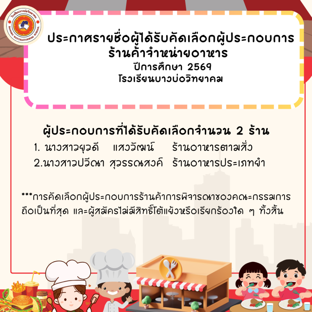 ประกาศ รายชื่อผู้ได้รับคัดเลือกผู้ประกอบการร้านค้าจำหน่ายอาหาร ปีการศึกษา 2569