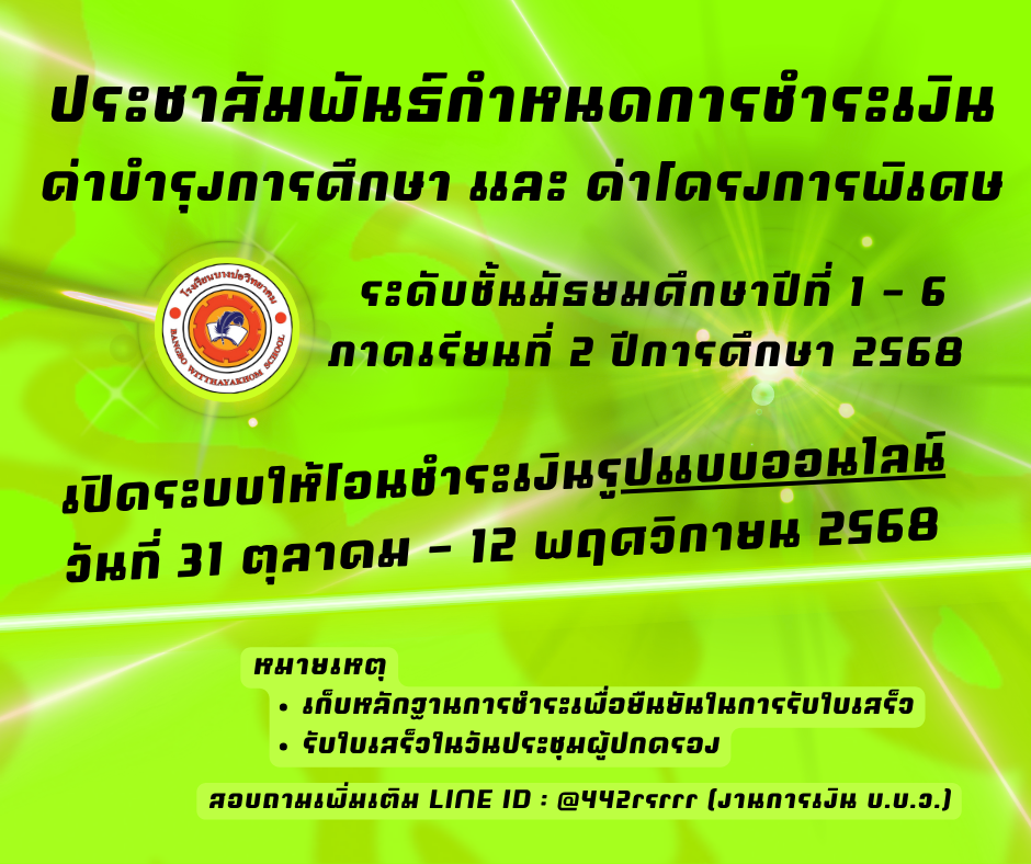 กำหนดการจ่ายค่าบำรุงการศึกษาและค่าโครงการพิเศษ ภาคเรียนที่ 2 ปีการศึกษา 2567 ระดับชั้นมัธยมศึกษาปีที่ 1 – 6