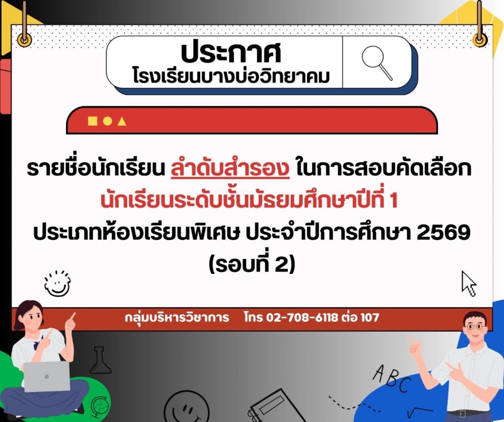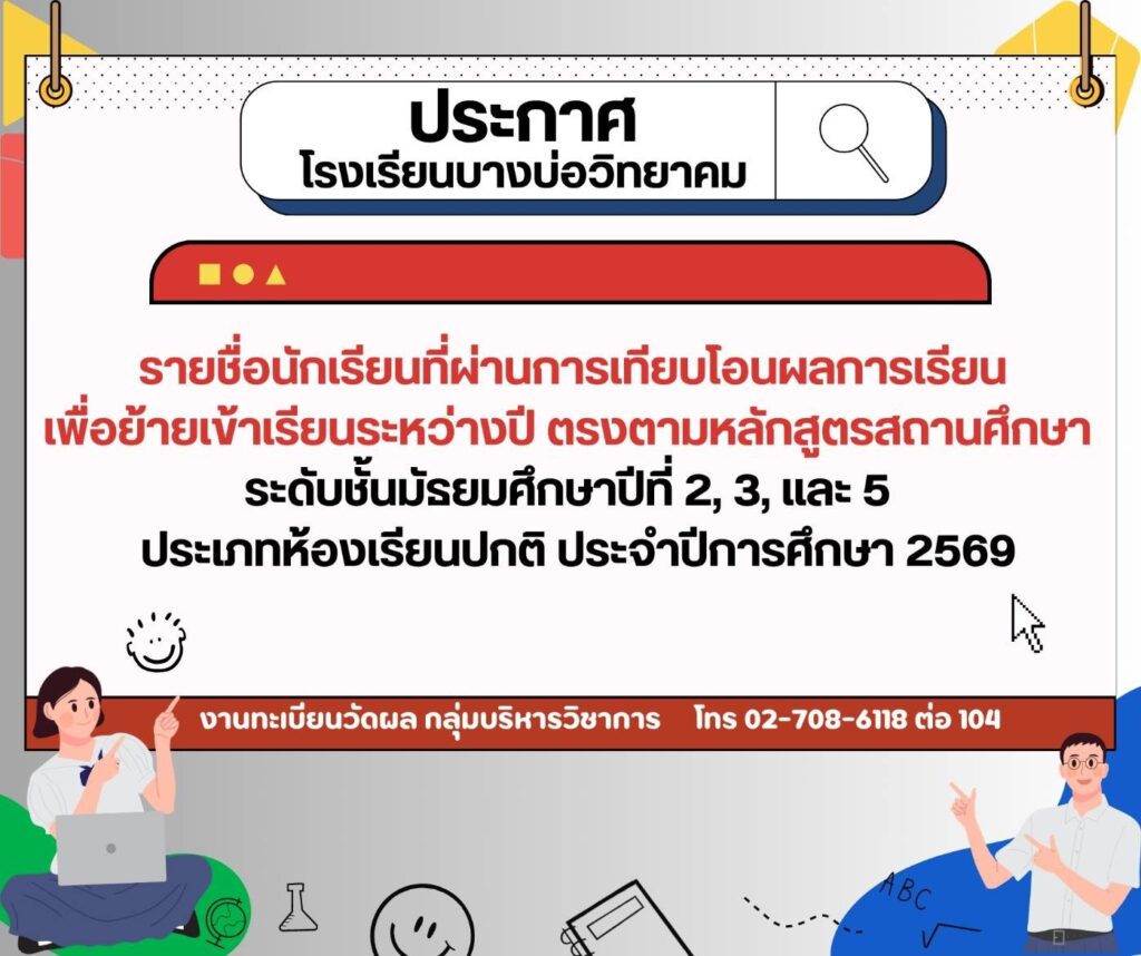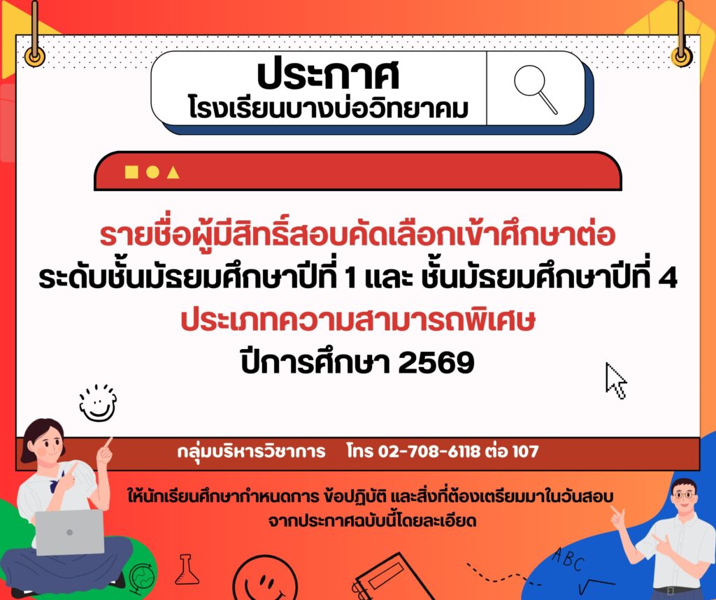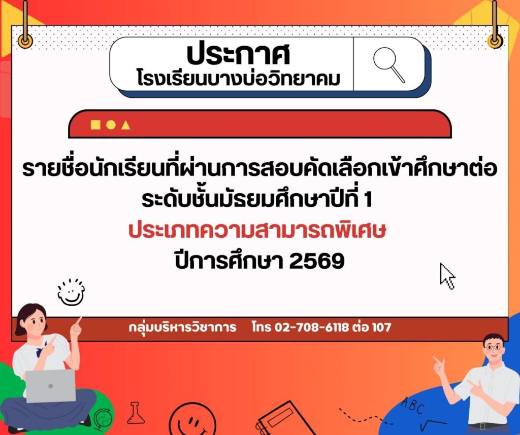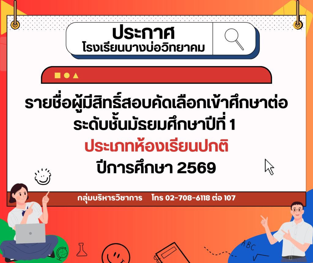 ประกาศรายชื่อนักเรียนที่ผ่านการสอบคัดเลือกเข้าศึกษาต่อระดับชั้นมัธยมศึกษาปีที่ 1 ประเภทห้องเรียนปกติ ประจำปีการศึกษา 2569