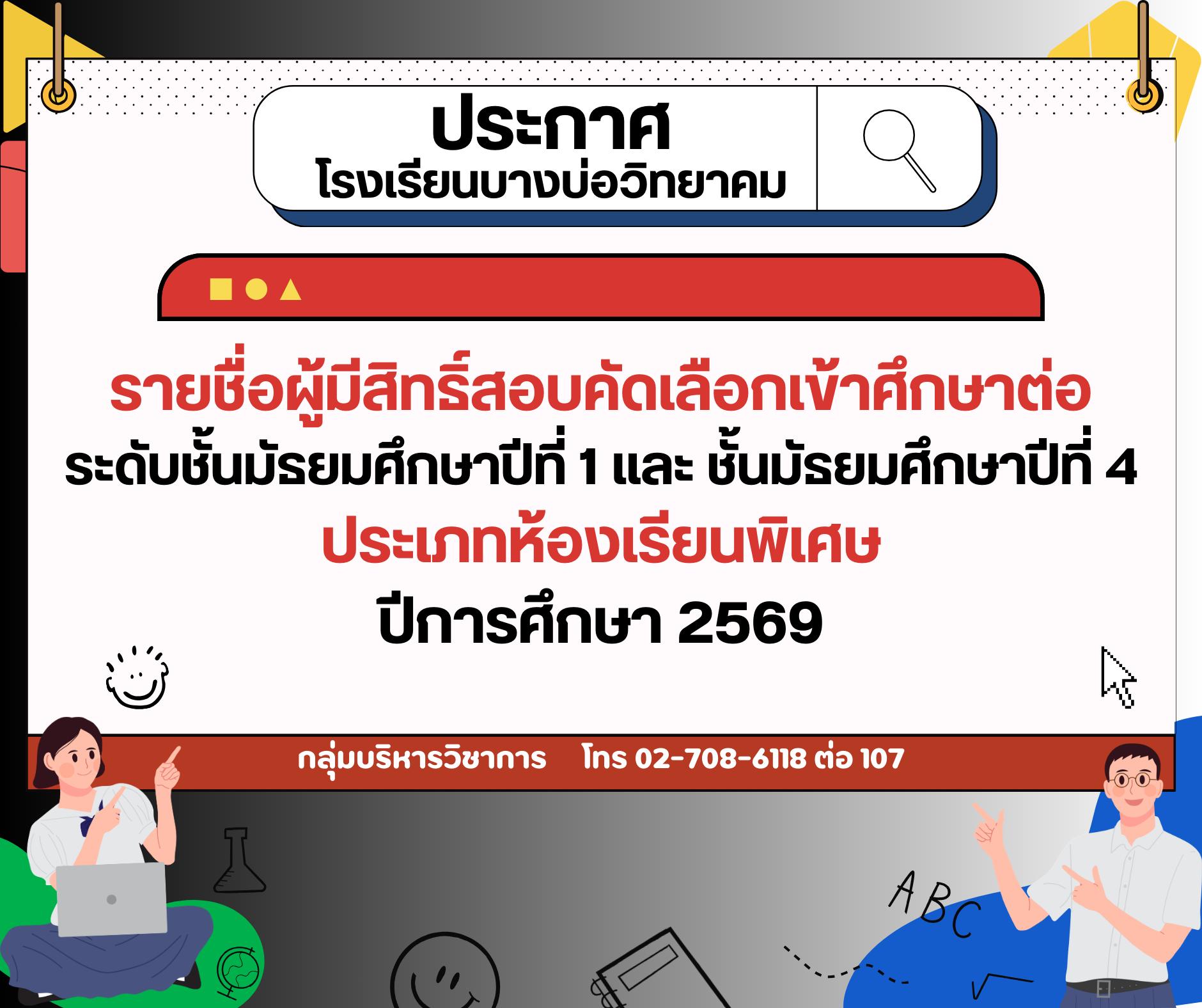 ประกาศรายชื่อนักเรียนผู้มีสิทธิ์สอบคัดเลือกโครงการห้องเรียนพิเศษ ระดับชั้นมัธยมศึกษาปีที่ 1 และระดับชั้นมัธยมศึกษาปีที่ 4 ปีการศึกษา 2569