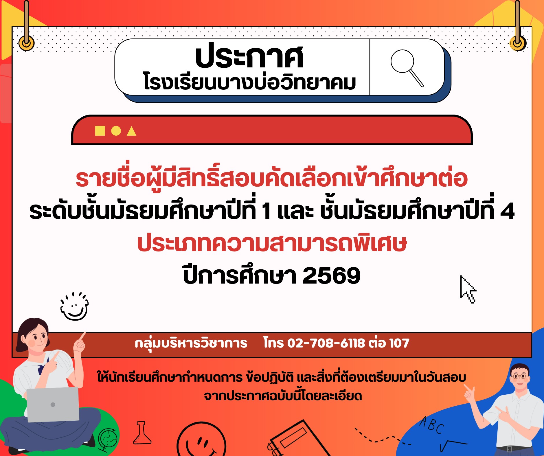 รายชื่อผู้มีสิทธิ์สอบ ม.1 และ ม.4 ประเภทความสามารถพิเศษ