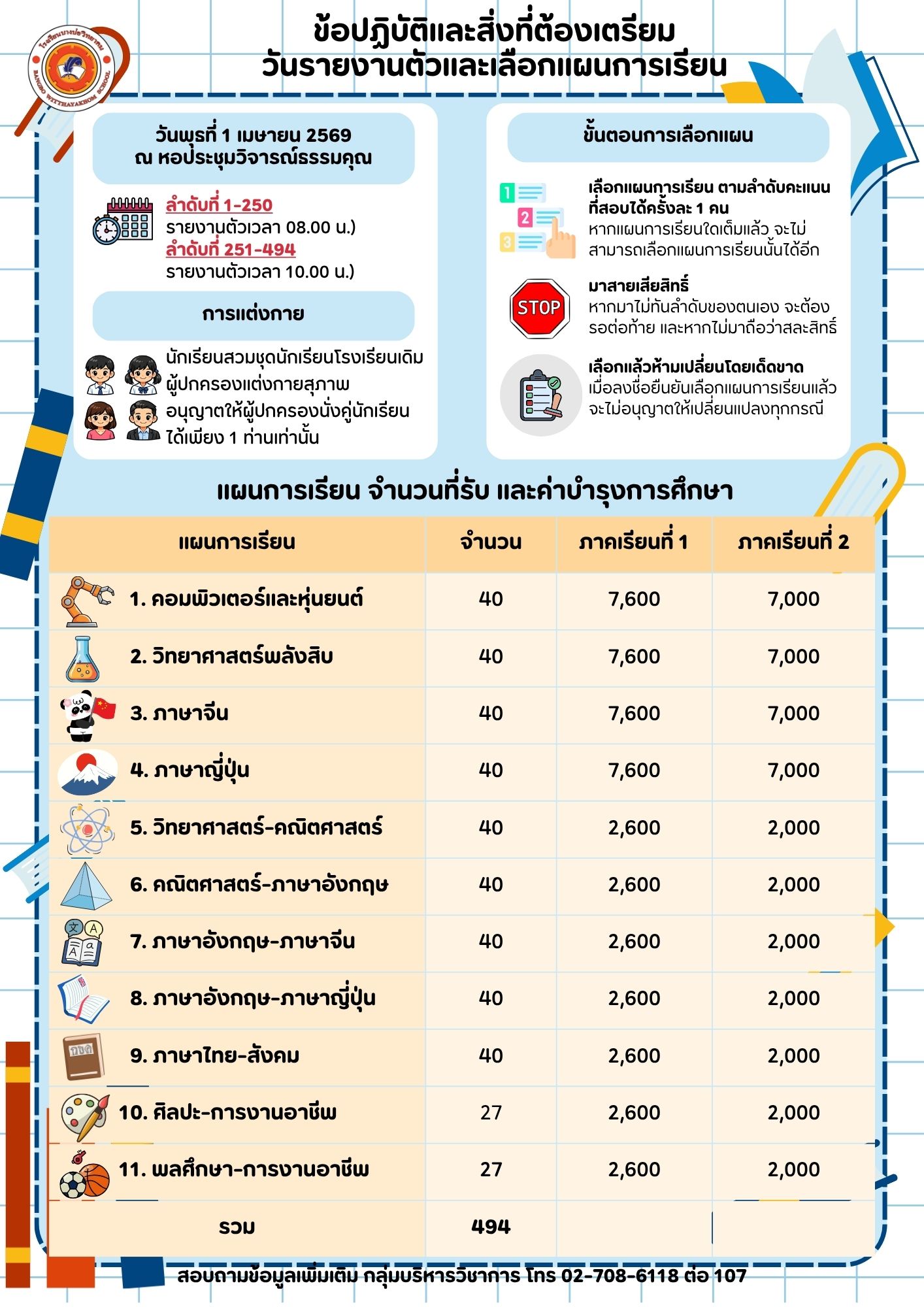 – นักเรียนที่สอบได้ลำดับที่ 1 – 250 ให้มารายงานตัวและเลือกแผนการเรียน เวลา 08.00 น.