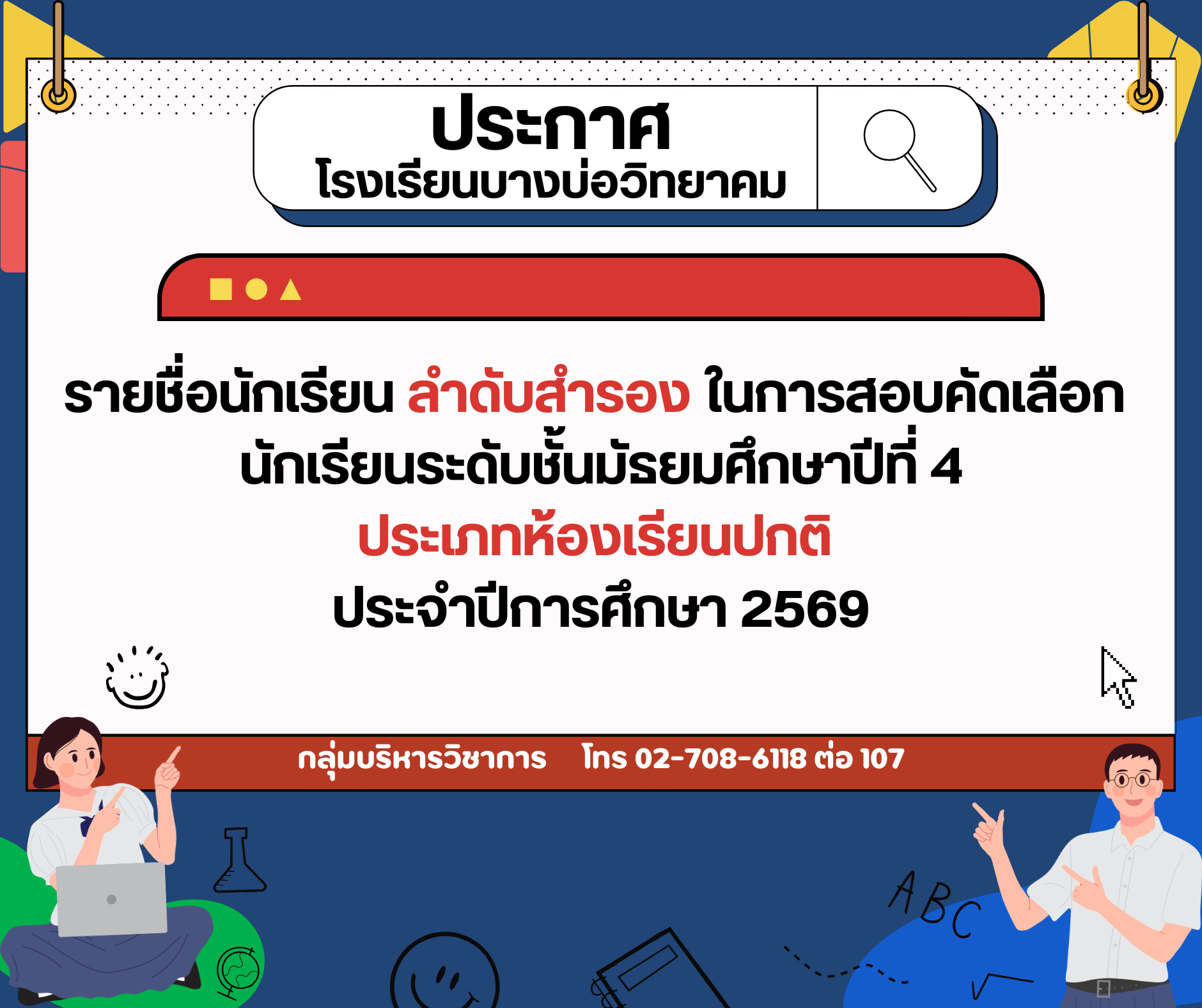 ประกาศรายชื่อนักเรียนลำดับสำรองในการสอบคัดเลือก นักเรียนระดับชั้นมัธยมศึกษาปีที่ 4 ประเภทห้องเรียนปกติ ประจำปีการศึกษา 2569 / กลุ่มบริหารวิชาการ, ประชาสัมพันธ์ / By admin ประกาศรายชื่อนักเรียน วันรายงานตัว : 31 มีนาคม 2569 เวลา : 13.00 น. ณ ห้องวิชาการ สอบถามข้อมูลเพิ่มเติม กลุ่มบริหารวิชาการ โทร 02-708-6118 ต่อ 107 14