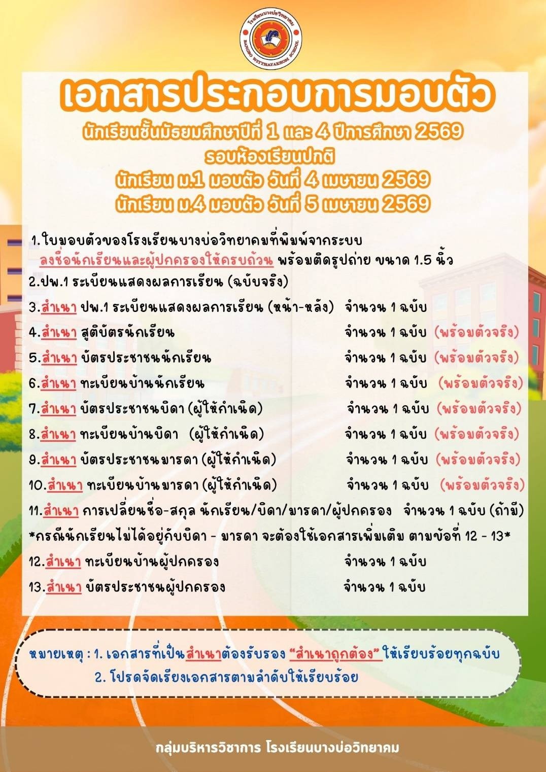 วันรายงานตัวและมอบตัว : 4 เมษายน 2569 เวลา 08.00 น. ณ ลานอเนกประสงค์